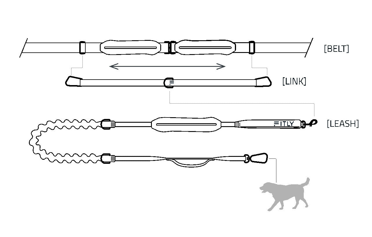 The LINK has 2 carabiners to latch on to the running belt's rings and a floating ring in the middle to link to the leash.